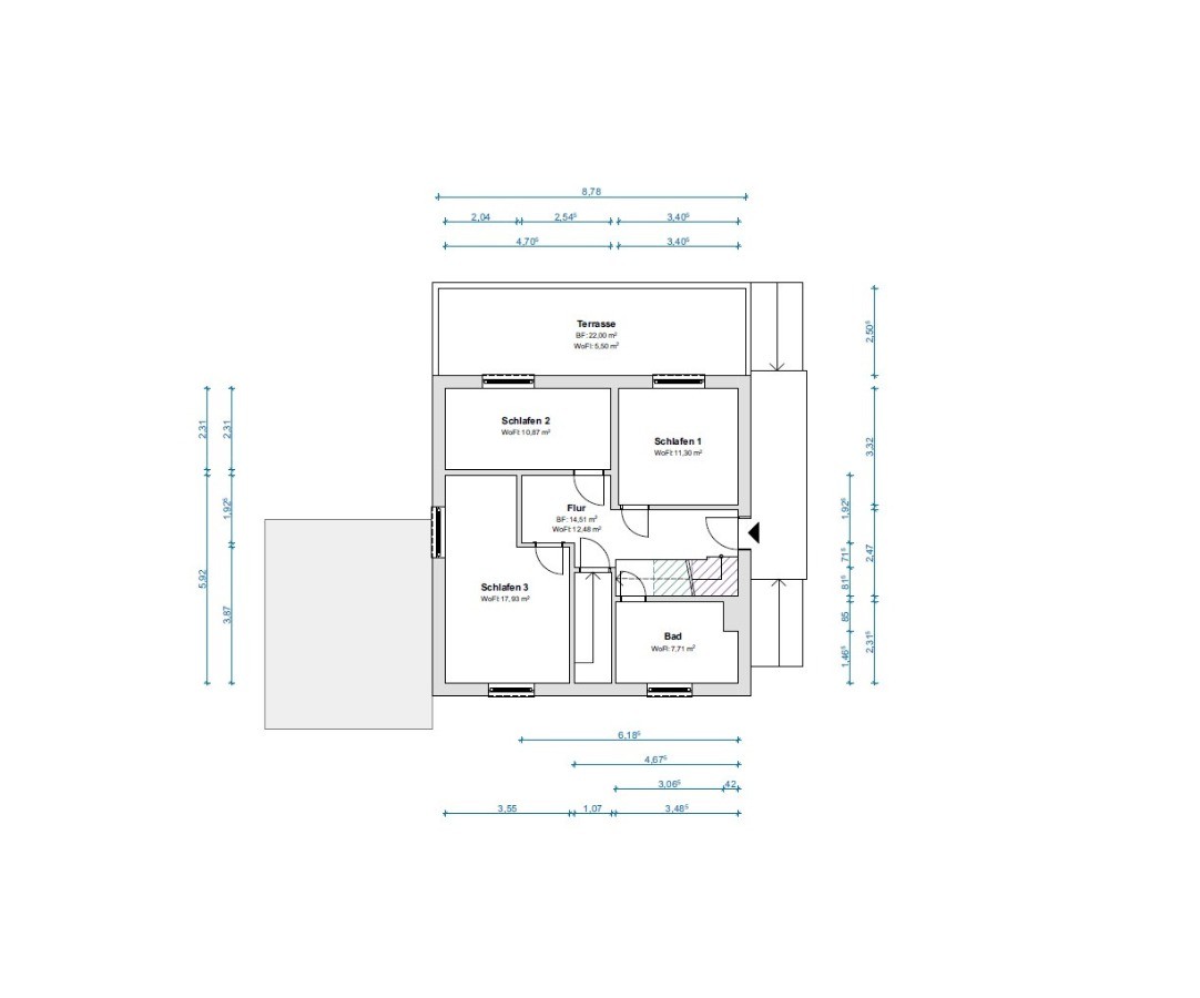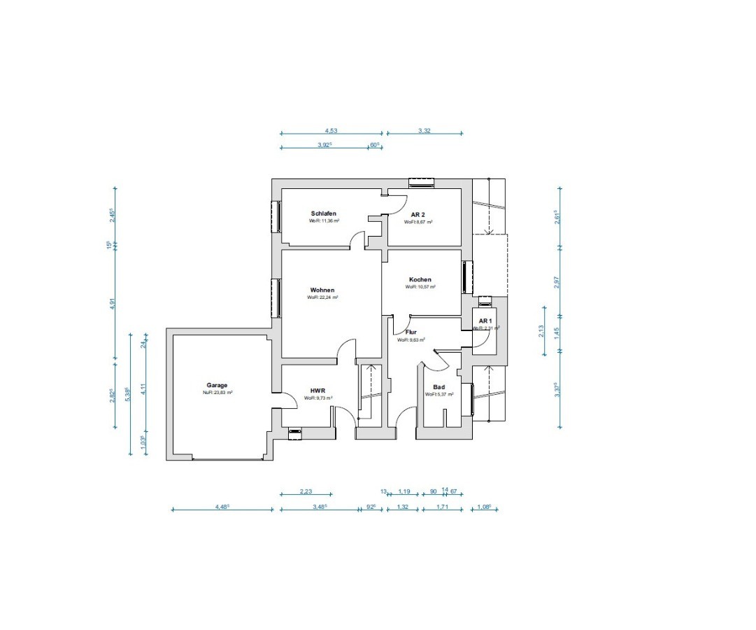 Davon entfallen ca. 125,10 m² Wohnfläche – mit ca. 65,79 m² im Erdgeschoss und ca. 59,31 m² im Dachgeschoss – sowie ca. 105,71 m² Nutzfläche im Souterrain und in der Garage.