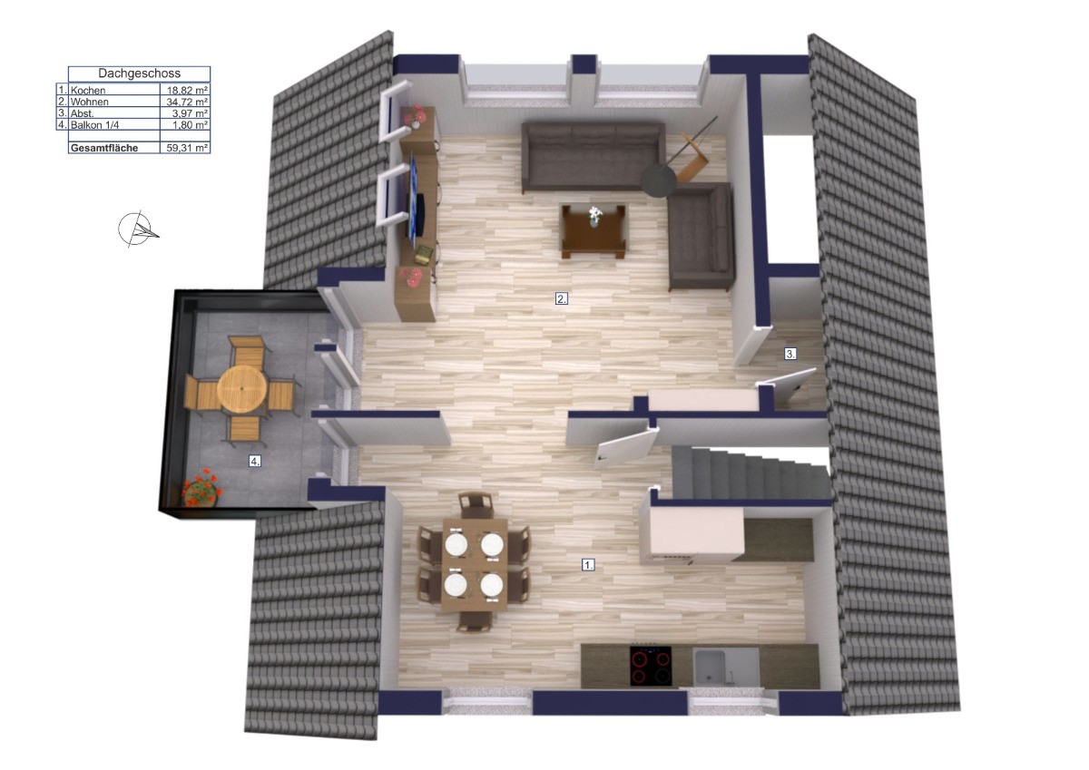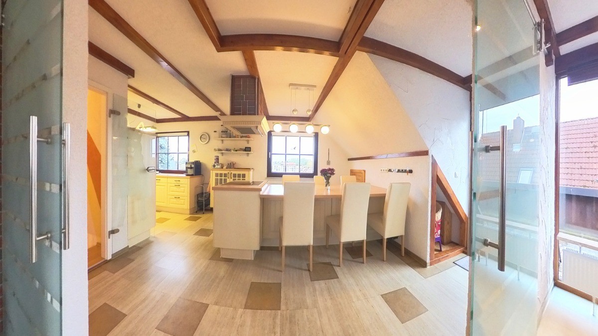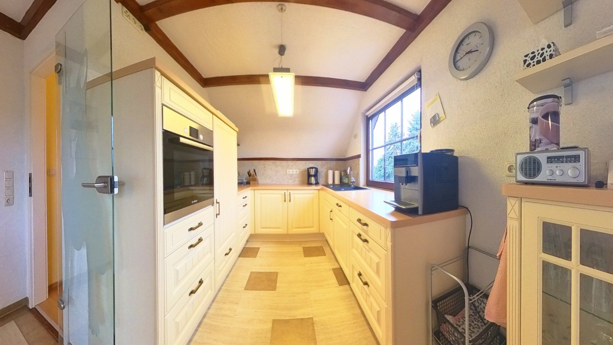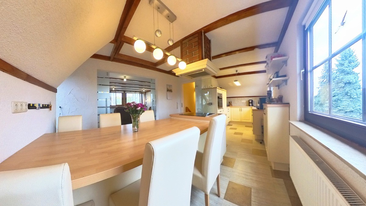 Das Dachgeschoss, das im Jahr 2009 vollständig erneuert wurde, beeindruckt mit einer offenen, lichtdurchfluteten Raumgestaltung. Hier erwartet Sie eine großzügige Wohnküche mit Einbauküche, Kochinsel und Essbereich, die harmonisch in den Wohnbereich übergeht. Dieser bietet durch Panoramafenster, Klimaanlage und einen Kaminofen eine besondere Wohnqualität. Vom Wohnzimmer aus gelangen Sie auf den Balkon mit Blick über das Grundstück. Eine praktische Abstellkammer ergänzt das Raumangebot.