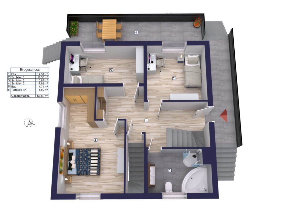 Im Erdgeschoss befinden sich drei Schlafzimmer, ein modernisiertes Hauptbadezimmer und ein zentraler Flur. Die Terrasse ist vom Garten aus zugänglich und bietet einen geschützten Platz für entspannte Stunden im Freien – ideal für Familien mit Kindern.