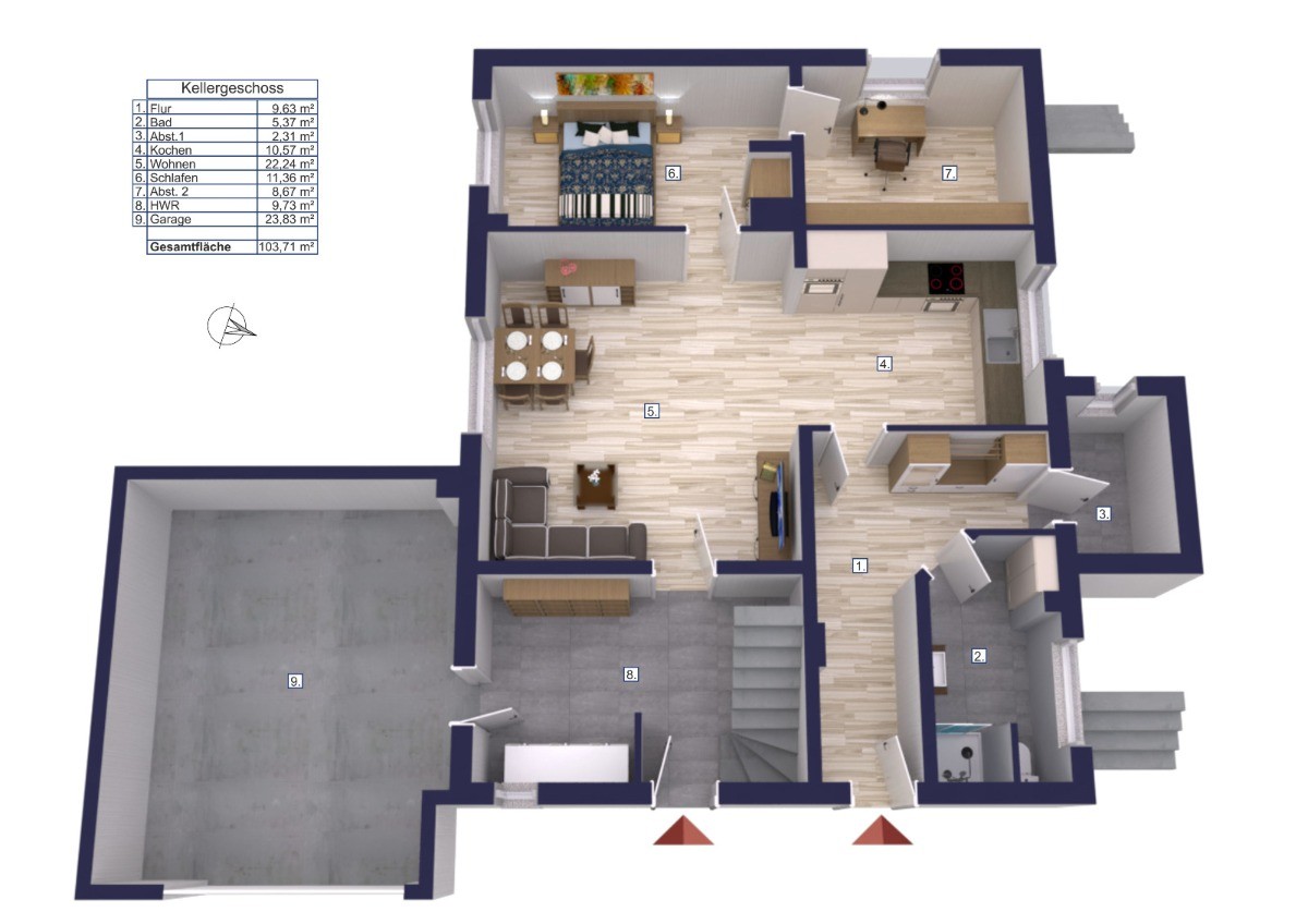 Im Souterrain stehen wohnlich ausgebaute Flächen (ca. 79,9 m²) mit Tageslichtbad, Hauswirtschaftsraum, Abstellraum, separatem Eingang und direktem Zugang zur Garage zur Verfügung.