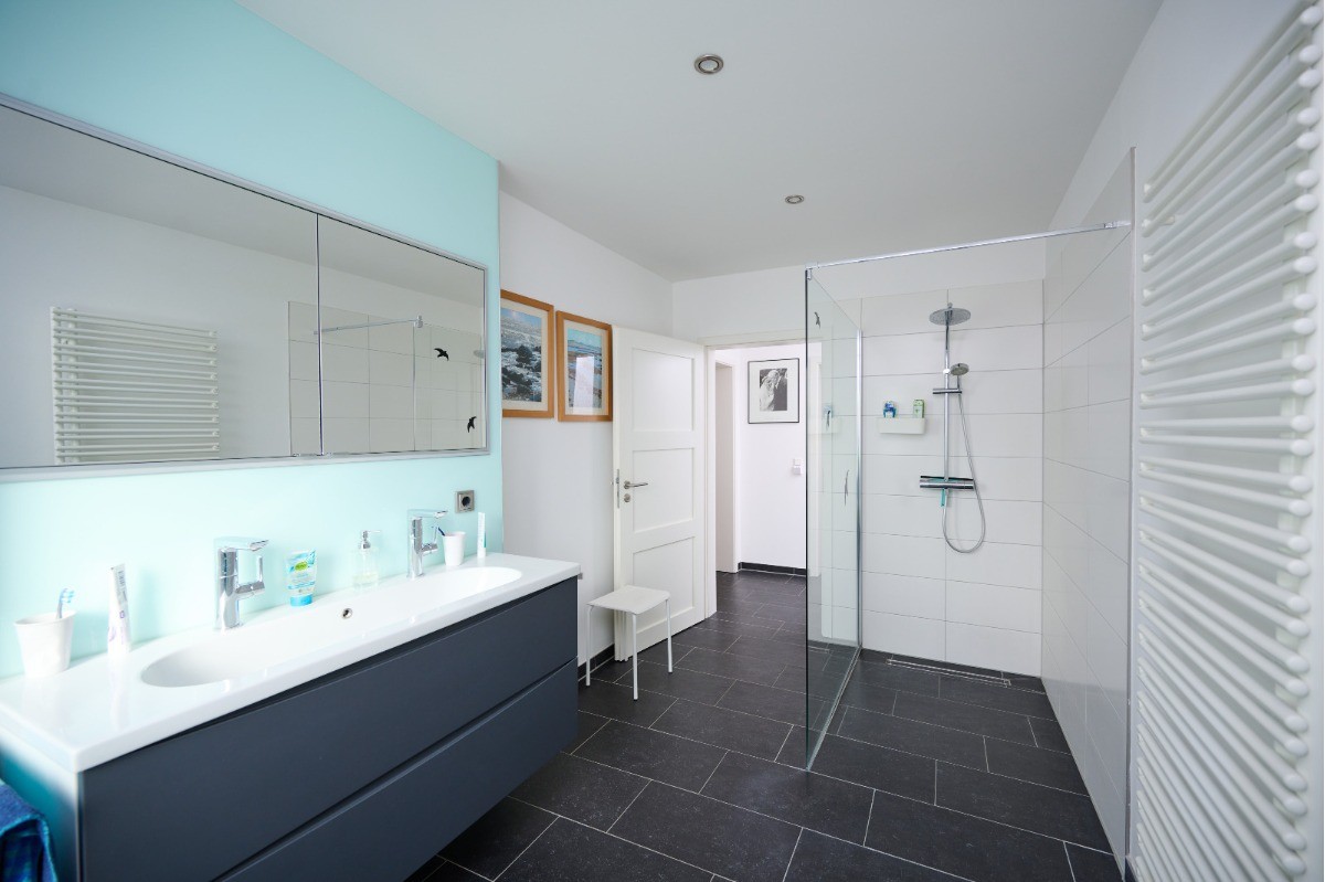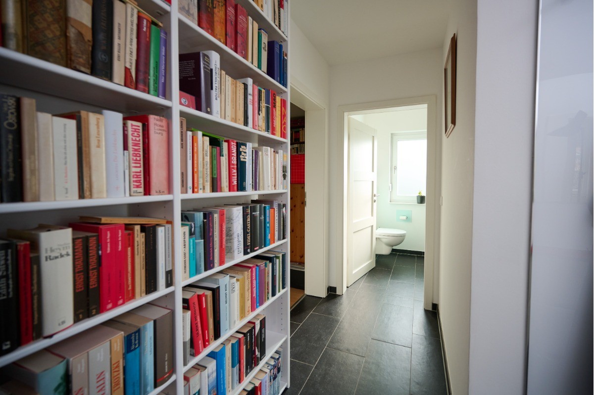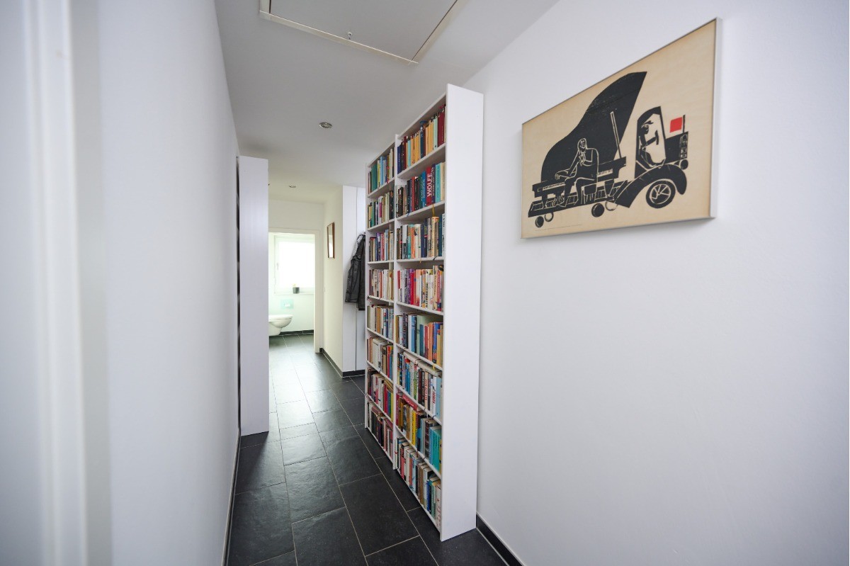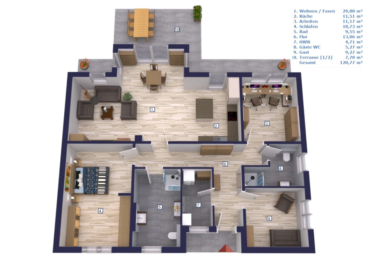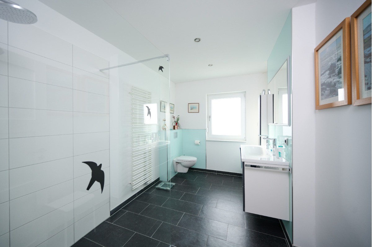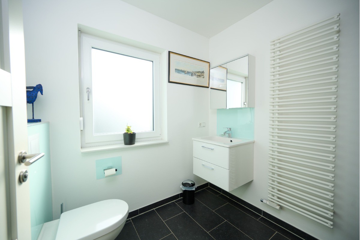 Ergänzt wird das Raumkonzept durch ein modernes Tageslichtbad (ca. 9,55 m²), ein separates Gäste-WC (ca. 5,27 m²), einen großzügigen Flurbereich sowie einen praktischen Hauswirtschaftsraum, die den Alltag komfortabel und funktional abrunden.