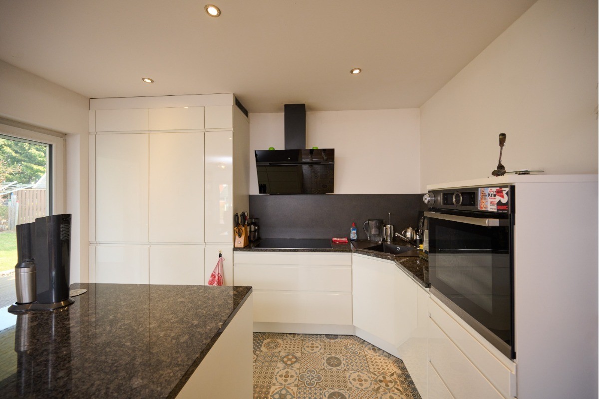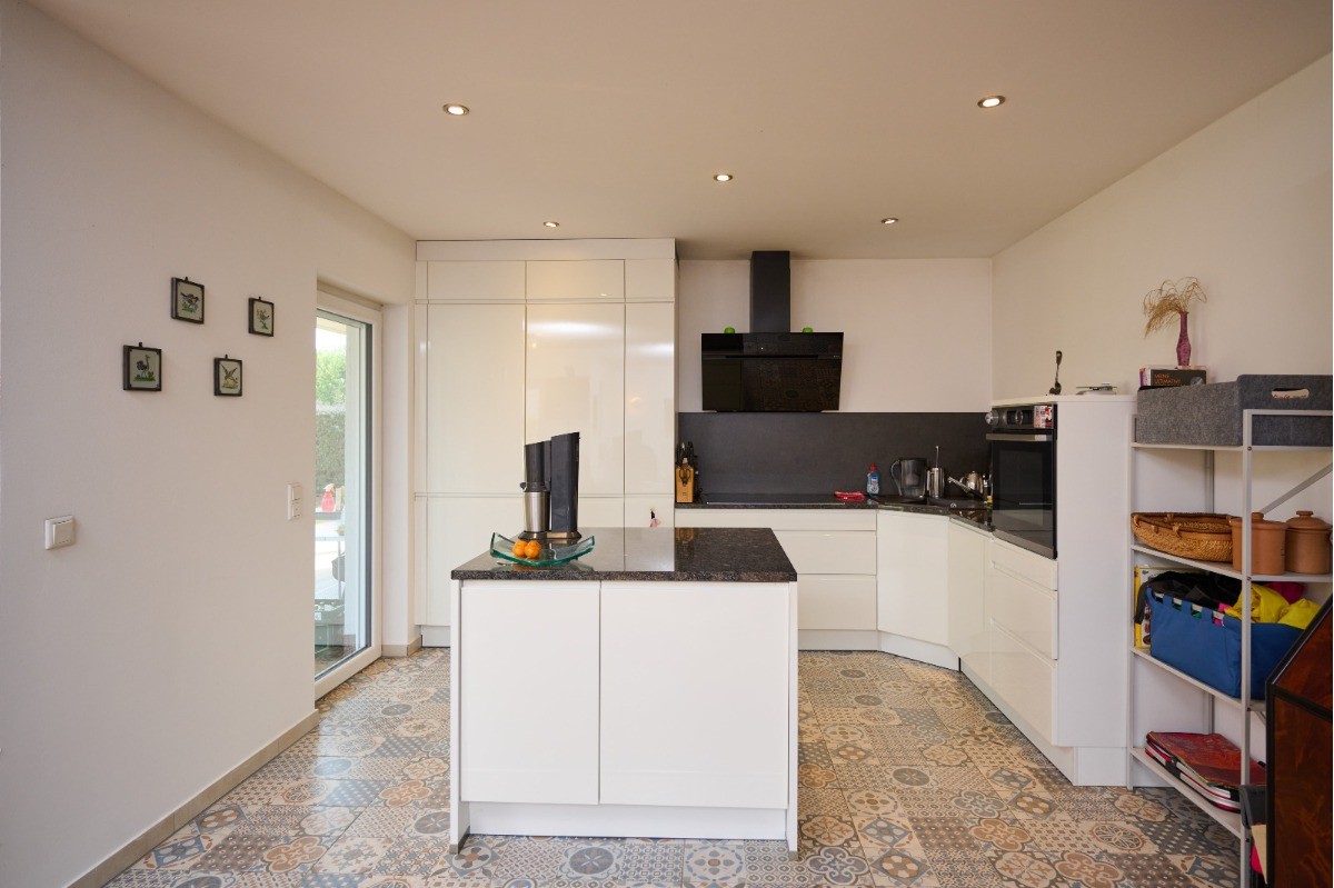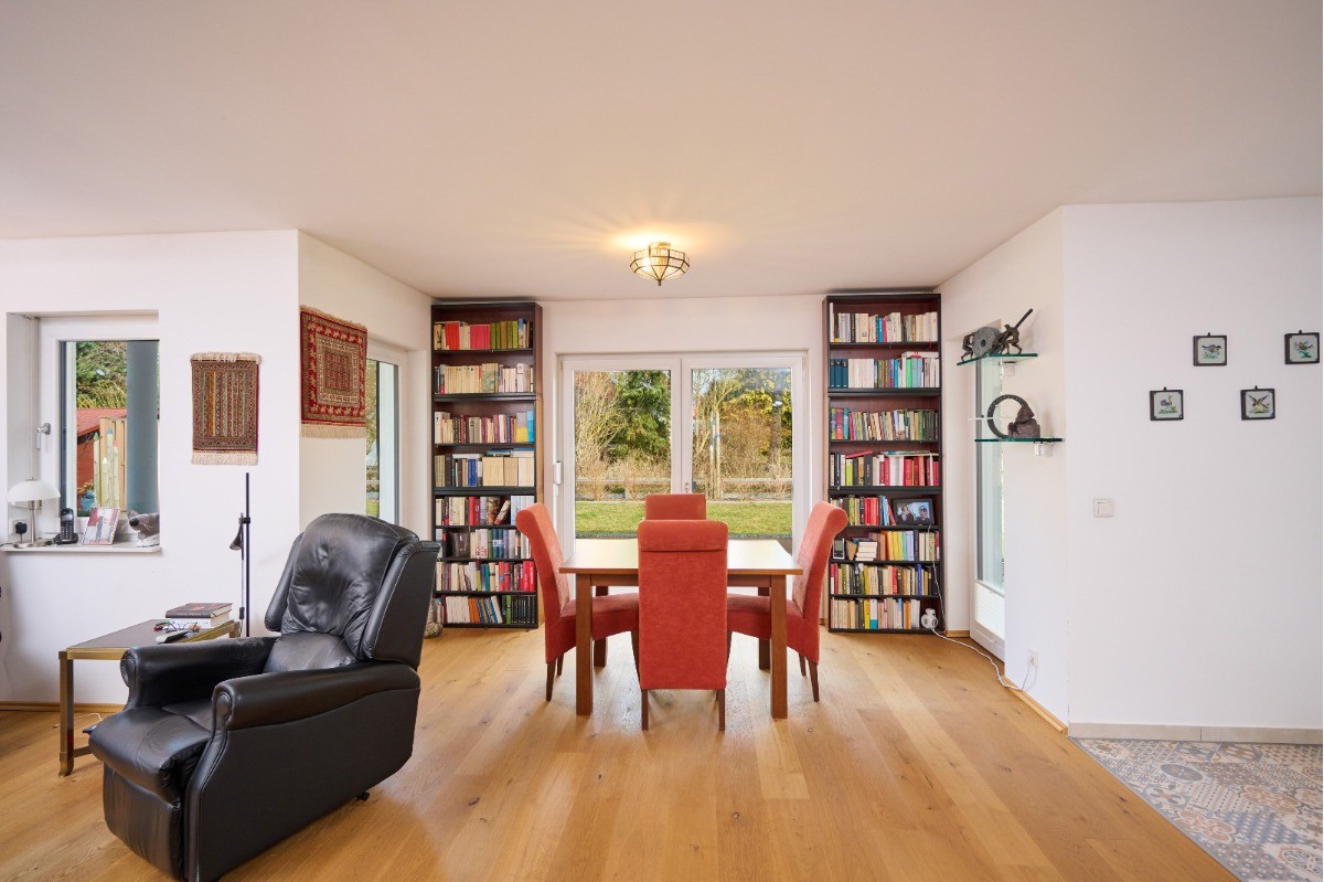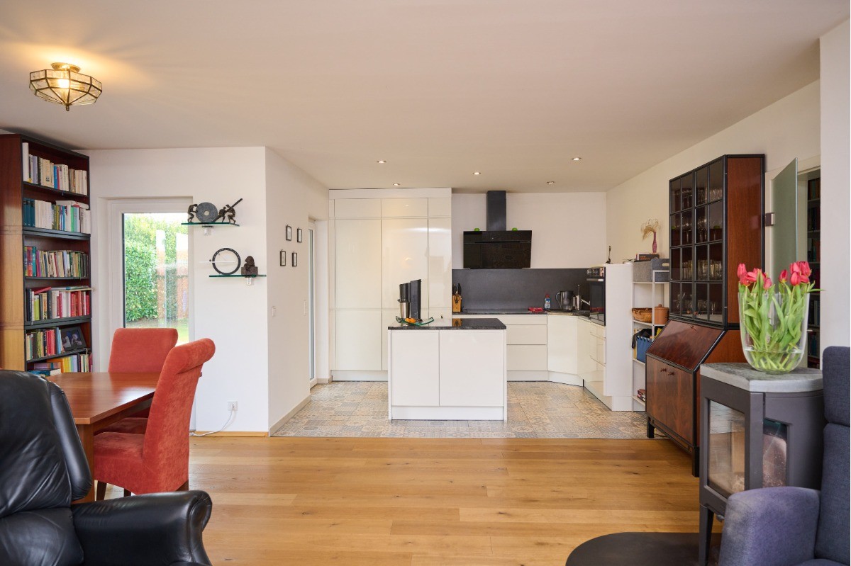 Die Wohnfläche von ca. 120,77 m² verteilt sich vollständig auf das Erdgeschoss und bietet ein durchgängig komfortables Wohnkonzept. Herzstück des Hauses ist der großzügige Wohn- und Essbereich mit ca. 29,80 m², der in Verbindung mit der offenen Küche (ca. 11,51 m²) ein modernes und kommunikatives Wohnambiente schafft. Große Fensterflächen sorgen für viel Tageslicht und unterstreichen das helle, freundliche Raumgefühl. Ein Kaminofen ergänzt den Wohnbereich und sorgt insbesondere in den Wintermonaten für eine behagliche Atmosphäre und zusätzliche Wohnqualität. Der direkte Zugang zu den Terrassen verbindet Innen- und Außenbereich auf harmonische Weise.