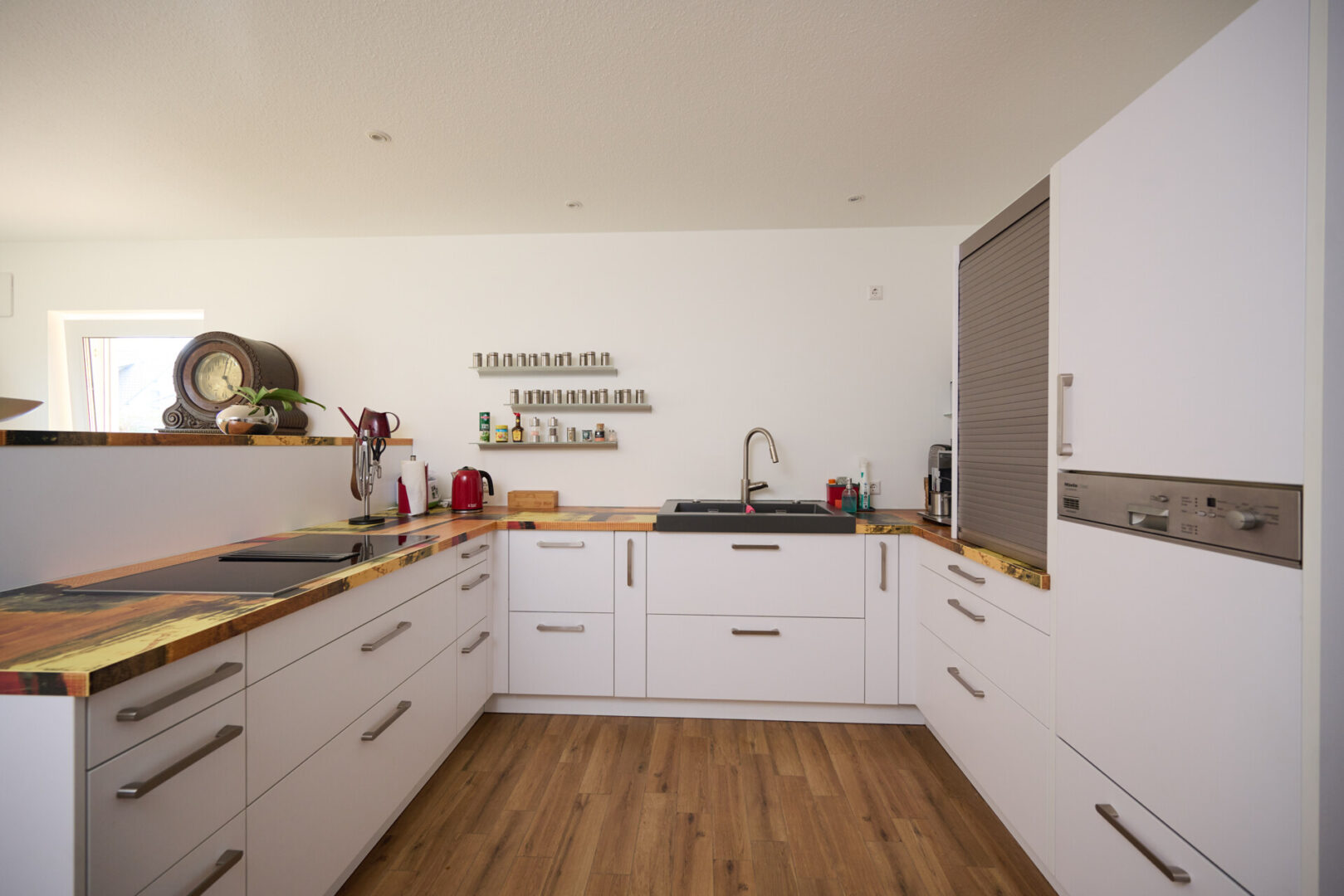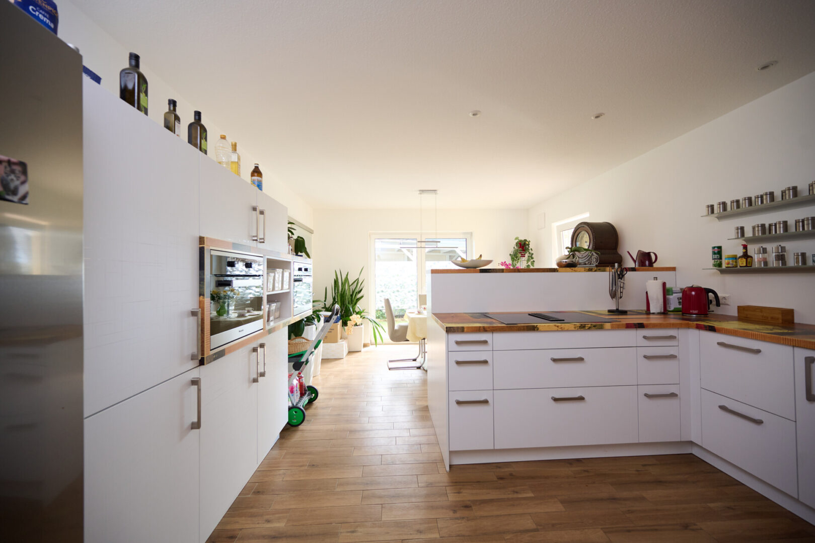 Über eine elegante Glasschiebetür öffnet sich das Wohnzimmer zur großzügigen Wohnküche. Diese ist sowohl vom Flur als auch vom Wohnbereich aus erreichbar und bildet den perfekten Ort für gemeinsames Kochen, Essen und Zusammensein. Der direkte Zugang zur sonnigen Südwest-Terrasse lädt dazu ein, das Leben auch im Freien zu genießen.