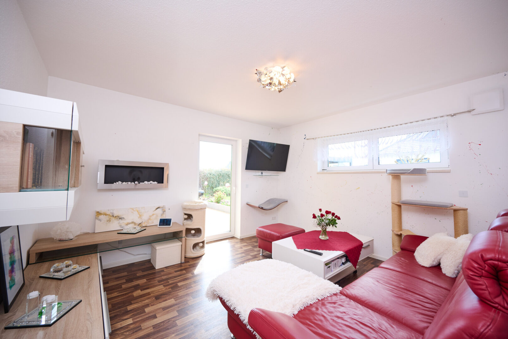 Das Herzstück des Hauses bildet das lichtdurchflutete Wohnzimmer. Große, überwiegend bodentiefe Fenster lassen viel Tageslicht herein und schaffen eine warme, einladende Atmosphäre. Der Kaminofen sorgt für behagliche Stunden und macht diesen Raum zum Mittelpunkt des täglichen Lebens. Von hier aus gelangen Sie direkt auf die Terrasse und in den Garten, sodass Innen- und Außenbereich harmonisch ineinander übergehen.