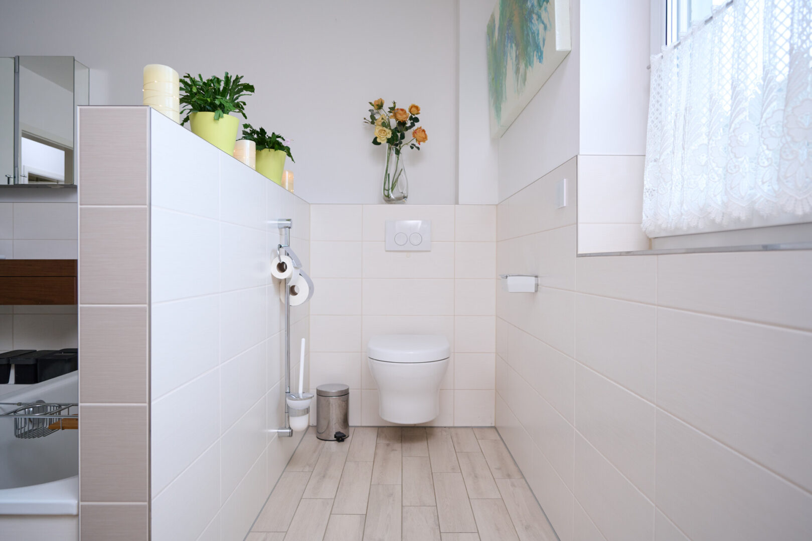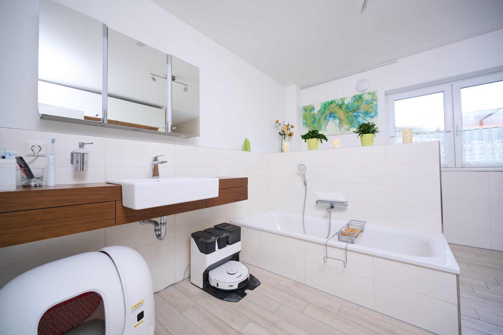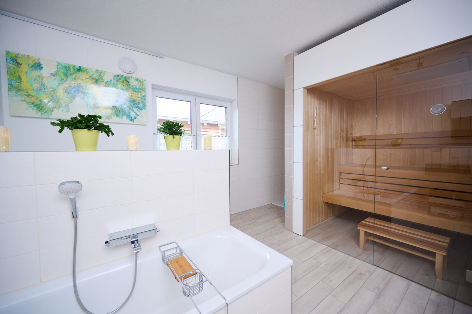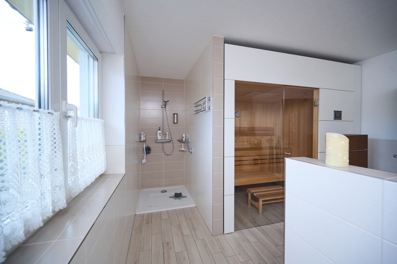 Das Badezimmer präsentiert sich als modernes Vollbad mit Fenster. Eine bodengleiche Walk-in-Dusche, eine Badewanne sowie ein optisch abgetrennter WC-Bereich sorgen für Komfort und Funktionalität. Als besonderes Highlight lädt die integrierte Sauna zu entspannten Wellnessmomenten im eigenen Zuhause ein.