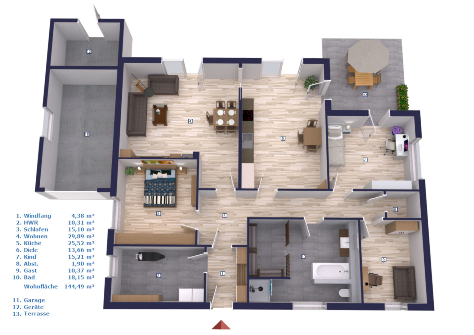 Der private Bereich des Hauses ist klar und funktional gegliedert. Das Schlafzimmer bietet einen ruhigen Rückzugsort, während das Kinderzimmer mit eigenem Zugang zur Terrasse besonders attraktiv gestaltet ist. Ein weiteres Zimmer eignet sich ideal als Gästezimmer oder Homeoffice und bietet flexible Nutzungsmöglichkeiten.