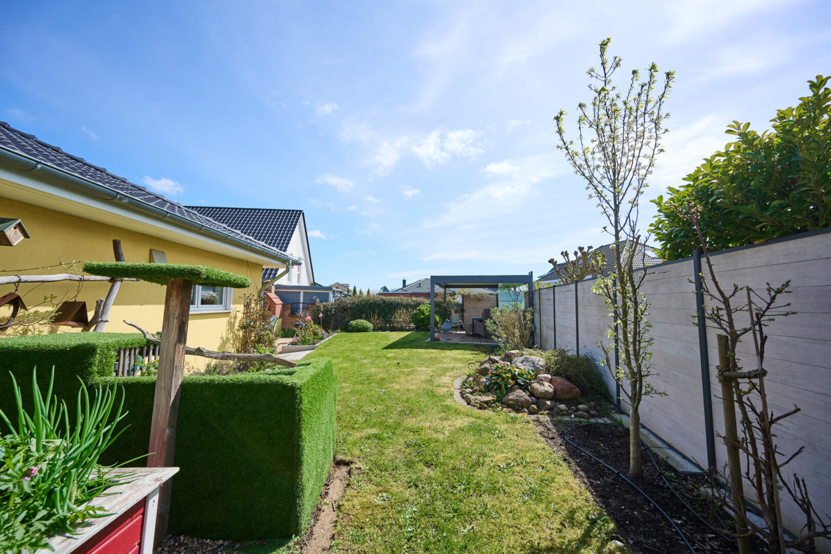 Auch der Außenbereich überzeugt auf ganzer Linie. Der hochwertig gestaltete Freisitz mit elektrischem Sonnenschutz erweitert den Wohnraum nach draußen. Der Garten bietet ausreichend Platz für Erholung und Familie und ist zusätzlich mit einem Unterflurbewässerungssystem ausgestattet, das die Pflege erleichtert.
